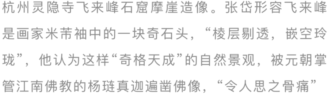 西湖西路景观中,有我们熟知的飞来峰、北高峰、韬光庵、青莲山房、玉泉寺、集庆寺、冷泉亭、灵隐寺、岣嵝山房、呼猿洞等。飞来峰是西湖一带的重要景观,东晋咸和初年,天竺高僧慧理登临此峰,感慨天竺灵鹫峰之小岭,不知何以飞来,此峰得名飞来峰。围绕飞来峰,慧理修建了灵隐寺等六寺,开启了西湖寺之景观的先河。张岱对飞来峰的评价很高,形容它是画家米芾袖中的一块奇石头,“棱层剔透,嵌空玲珑”,凡是爱石之人,见了都要惊呼感叹。他气愤地写道:这样“奇格天成”的自然景观,却被元朝掌管江南佛教的杨琏真迦遍凿佛像,“妄遭锥凿,令人思之骨痛”。据说张岱年轻时来飞来峰,还一怒之下搬石头砸坏了杨琏真迦的雕像。