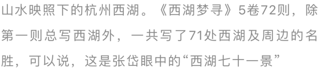 今天的游客来到西湖,很多只奔着两堤三岛、断桥、雷峰塔、寒山寺,其实西湖比我们想象中要大得多。《西湖梦寻》5卷72则,除第一则总写西湖之外,一共写了71处西湖及周边的名胜,可以说,这是张岱眼中的“西湖七十一景”,其中几经历史变迁而今仍存的景点也有约20处之多。