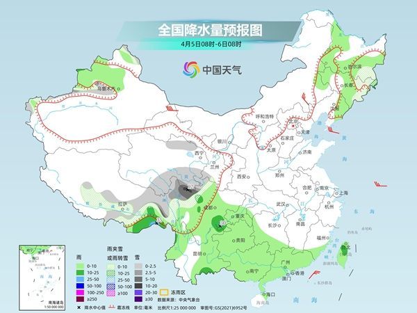 具体来看,中央气象台预计,今天,黑龙江东南部、吉林东部、新疆沿天山地区、西藏东北部、青海北部和南部、甘肃南部、川西高原中北部等地部分地区有小到中雪或雨夹雪,其中,川西高原北部等地部分地区有大到暴雪。新疆伊犁河谷、西藏东南部、黑龙江西部和南部、吉林中西部、辽宁东部、湖南南部和西部、广东、广西、四川盆地、重庆、贵州、云南大部、台湾岛等地部分地区有小到中雨,其中,西藏东南部、四川盆地东南部等地部分地区有大雨。